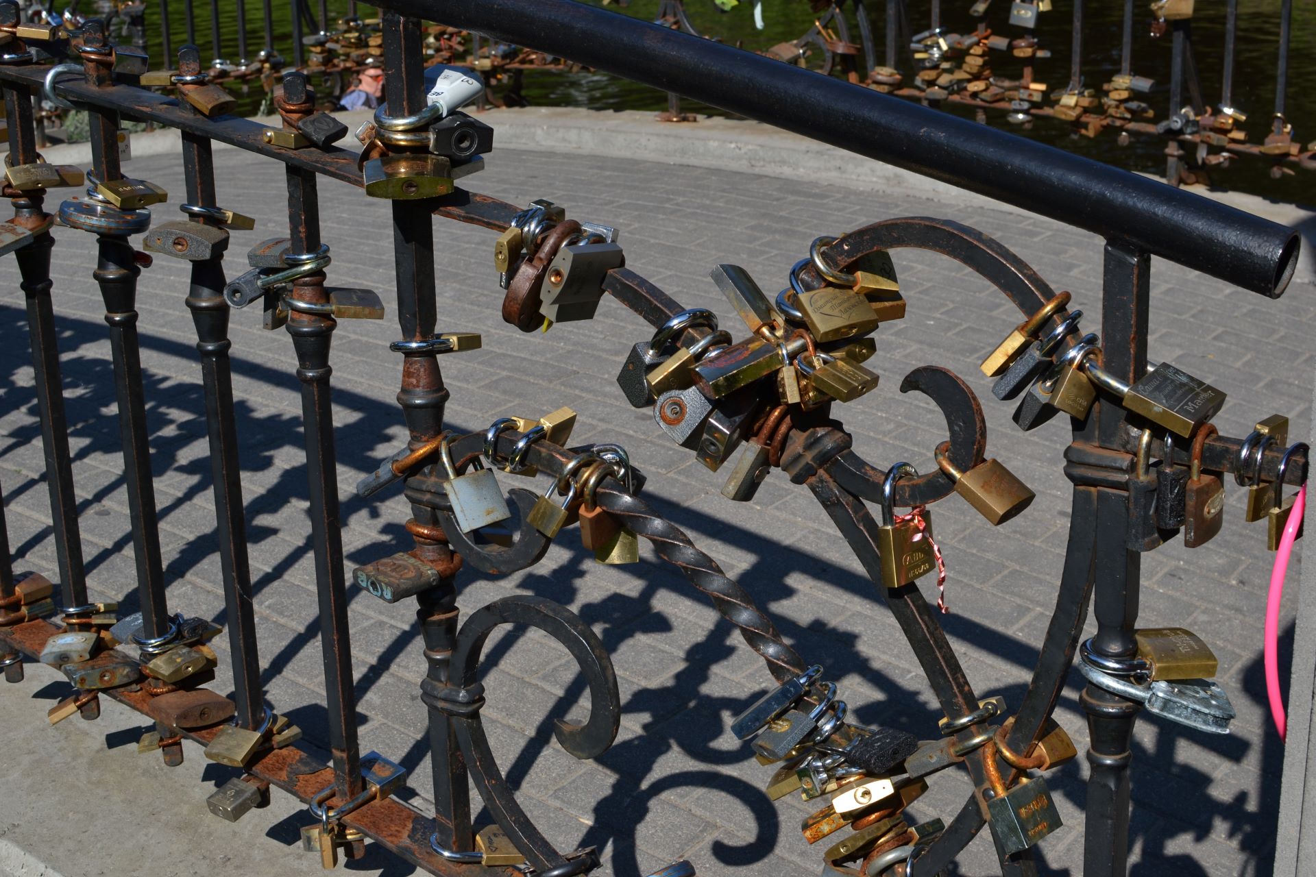 Overigens hebben wij ook bij diverse bruggen in Litouwen hangsloten gezien met de namen van pasgehuwden erin gegraveerd. En eenmaal hebben wij zelfs twee handboeien aan een brug zien hangen, gegraveerd met namen van pasgehuwden (zouden die mensen een kinky huwelijk hebben?).