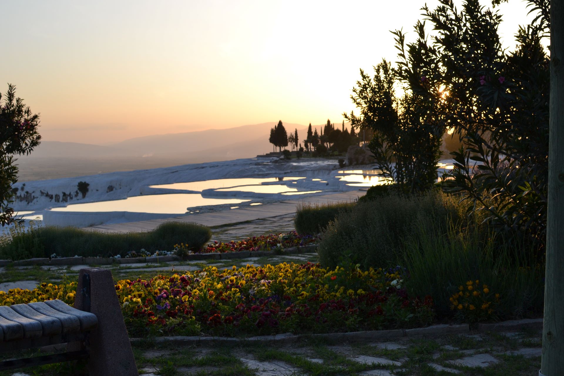 Wij zijn om 18.00 uur pas naar boven gaan lopen. En dat bleek een heel goed tijdstip, omdat: het niet meer zo warm is, het niet meer zo druk is (de vele touringcars met ladingen toeristen zijn dan weer weg) en de lichtinval op dat moment van de dag prachtig is, aldus amateurfotograaf Ernst. Boven zijn nog restanten te vinden van een oude stad Hierapolis uit de tweede eeuw voor Christus. De warmwaterbronnen/thermen waren in de oude tijd heel populair.