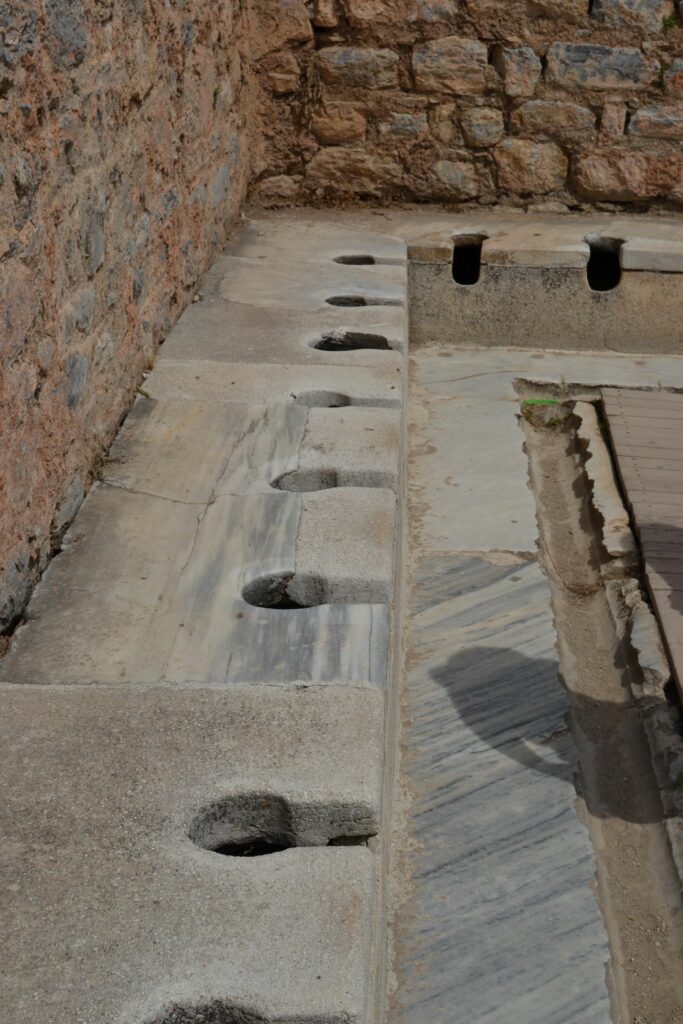 In Efeze zijn toiletten gevonden die met recht “openbaar” genoemd kunnen worden. Het waren namelijk 40 gaten in een muur naast elkaar, zonder privacy! Het verhaal gaat dat toiletteren in die tijd een hele sociale gebeurtenis was en dat men gewoon gezellig naast elkaar zat te “keutelen”. Als je wat rijker was, dan liet je eerst een slaaf een half uurtje van te voren alvast op de steen zitten, zodat deze was voorverwarmd. Overigens kunnen de toiletten in het huidige Turkije ook bijna nergens op slot, maar dat heeft misschien meer te maken met achterstallig onderhoud…