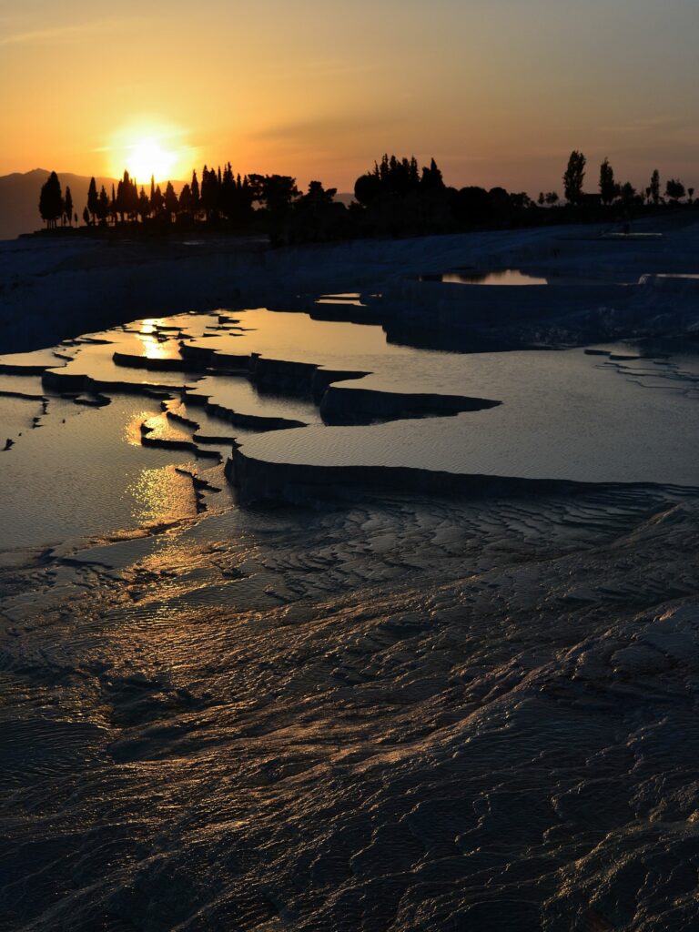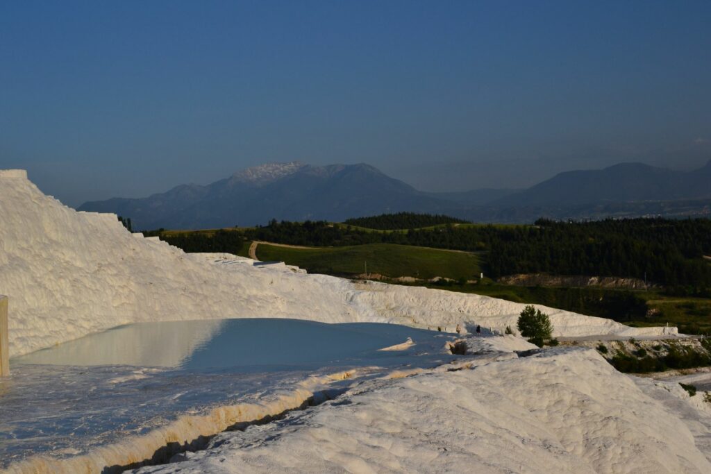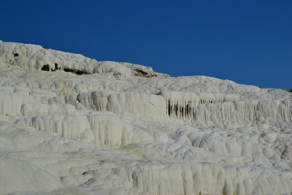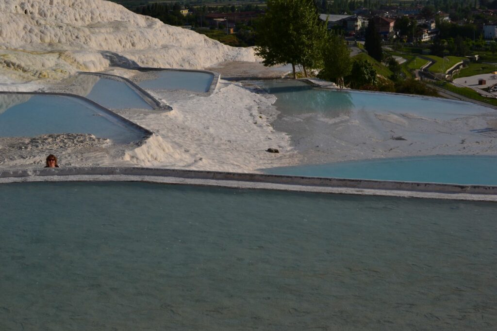 Wat een mooi natuurverschijnsel is dit! Pamuk is Turks voor katoen of sneeuwwit. Nou, en wit was het! Deze wereldberoemde kalksteenterrassen die beschermd worden door Unesco lopen als witblauwe kalksteenbassins als tot steen geworden watervallen over honderd meter de heuvel af. Ze zijn het resultaat van een bron die koolstofdioxide en calciumcarbonaat bevat. Om de rotsen te beschermen, mag je deze tegenwoordig alleen nog met je blote voeten betreden, maar het voelt heerlijk aan als het (zeer) warme water over je voeten stroomt. Onze camping lag aan de voet van de kalksteenrotsen.