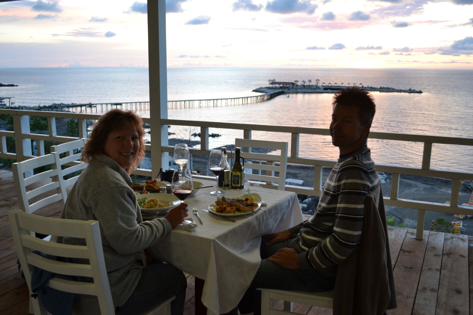 We zagen bij Dürres pas voor het eerst de Albanese kust, en waren geschrokken van de lelijke skyline. De hele kust staat volgebouwd met hotels, restaurants en appartementsgebouwen. Maar tien kilometer ten zuiden van Dürres hebben we een paar dagen op een mooie aan het strand gelegen camping gestaan. Ook ontmoetten we daar een leuke Duitse vrouw die fietsend vanaf Zagreb, Kroatië, door Albanië naar Griekenland onderweg was. Zij klaagde ook over de kwaliteit van de wegen in Albanië… Wij hebben met zijn drieën heerlijk gedineerd op een terrasje op het strand met uitzicht over de zee. Heel gezellig.