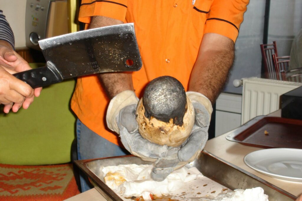 Op de laatste avond van ons bezoek aan Cappadocië hebben we een traditioneel Turks bruiloftsdiner meegemaakt. De hoofdmaaltijd bestaat uit stoofvlees met groente en dit zit in een aardewerken kan. Deze kan is afgestopt met een homp brood. Vervolgens moet de bruidegom de stop eraf hakken met een hakmes. Als dit goed gebeurt, dan levert dit geluk op voor de bruid en bruidegom en hun familie. In dit geval mochten de dames uit de reisgroep het proberen, ik ging als eerste. Nou, het is goed dat wij al gelukkig getrouwd zijn, want ik hakte de hele bovenkant van de kan.