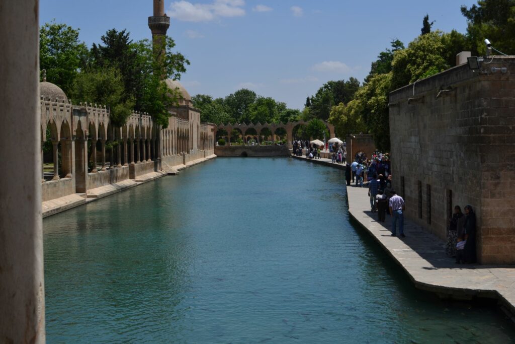 Şanliurfa (vroeger Edessa, zoals de stad in de Bijbel wordt genoemd) is een van de oudste steden uit de geschiedenis. De aartsvader Abraham zou er in een grot geboren zijn. En de grote vijver in de stad zou Abraham gered hebben uit de handen van de Assyrische koning Nemrud, omdat God het vuur waarin Abraham gegooid zou moeten worden liet veranderen in water. Het is ook een heilige stad, waar de Turken massaal op bedevaart komen.