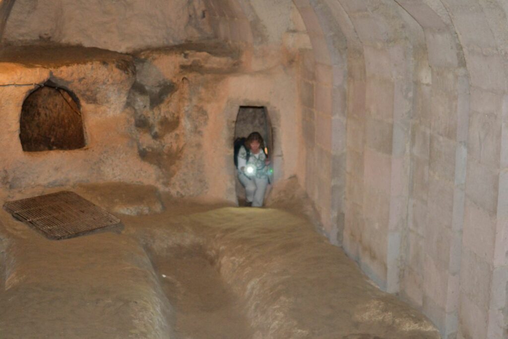 Bijzonder detail: er was natuurlijk een enorme voorraad aan menselijke ontlasting. Dit werd opgevangen en gebruikt als bemesting voor de wijngaarden zodra het weer veilig was om naar buiten te gaan! Het verhaal gaat dat de kwaliteit van de huidige wijn uit Cappadocië nog steeds te danken is aan deze manier van bemesten… Wij hebben de wijn uiteraard geproefd en hij is heerlijk!