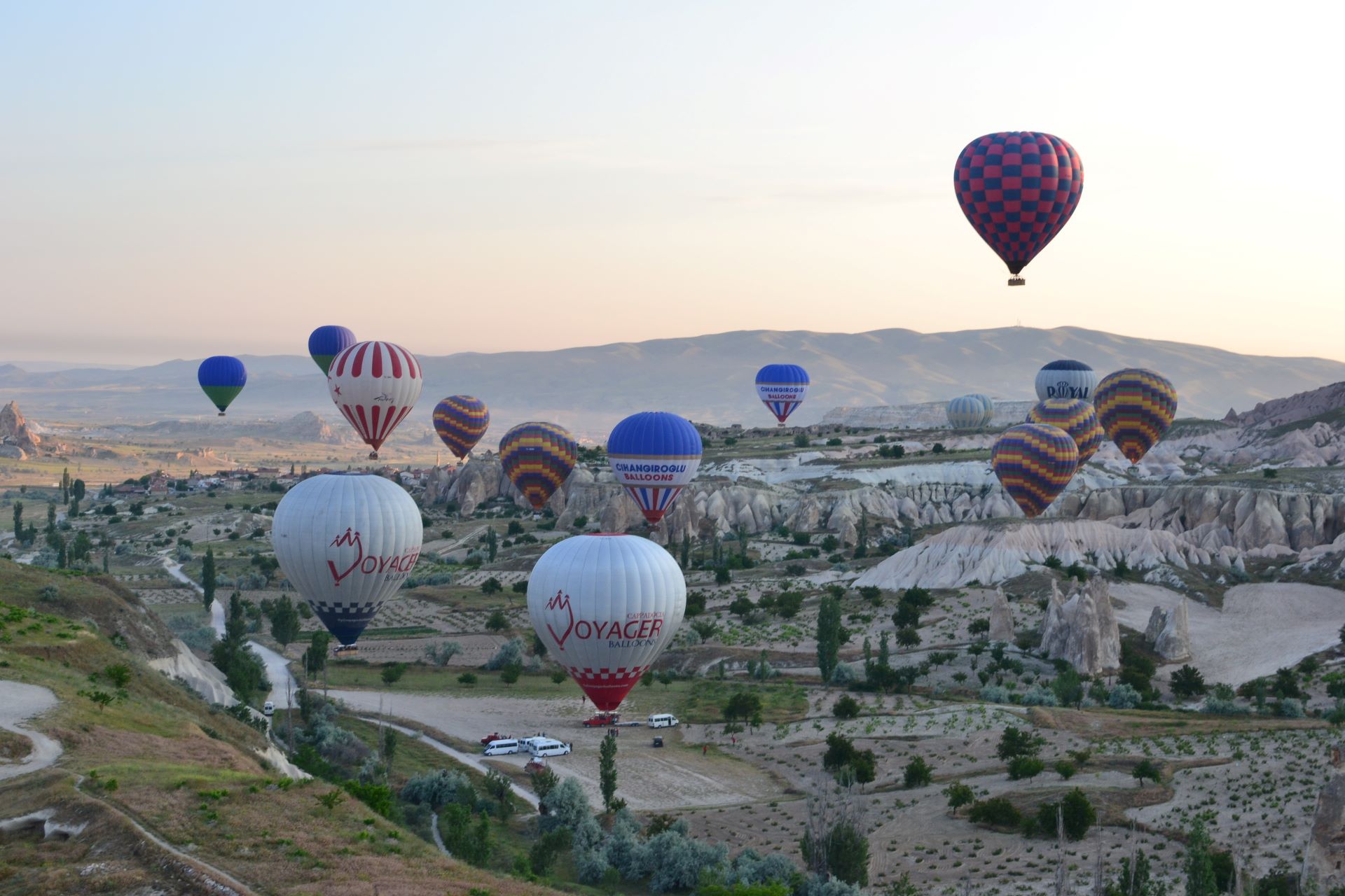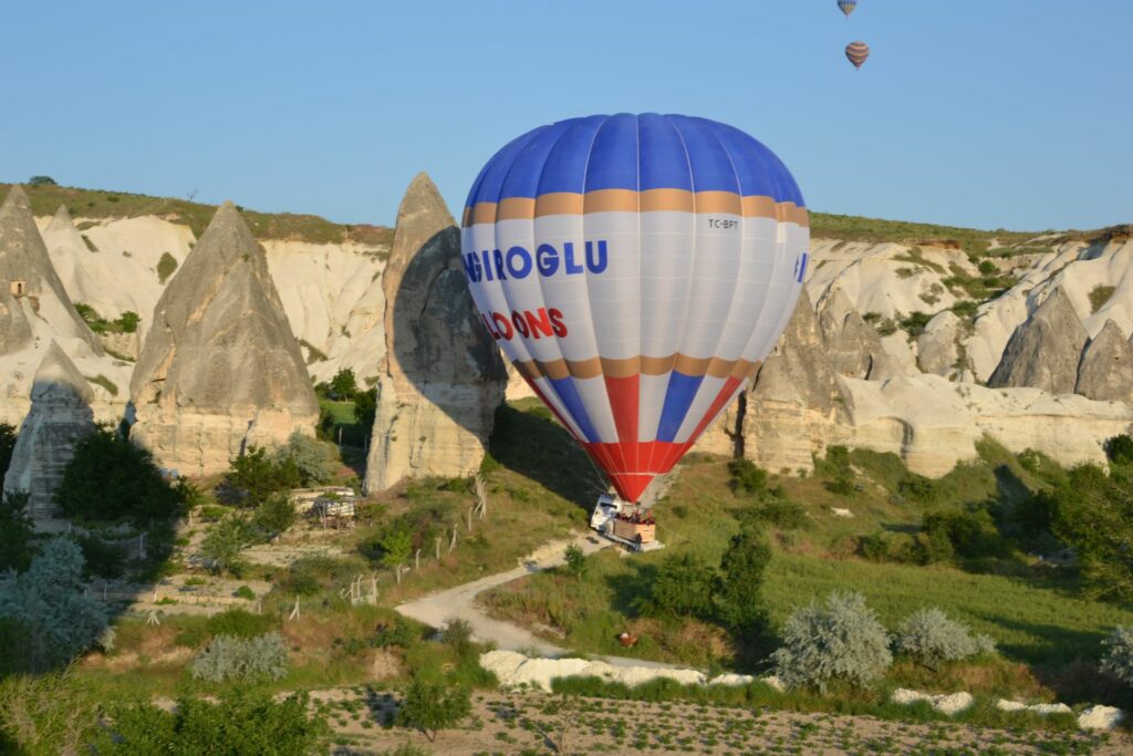 Het was mooi, rustig weer en we vlogen over het prachtige dal van Göreme. De luchtballonvaarder (ook wel Kamikazepiloot genoemd) vloog soms zeer dicht over de rotsen heen om ons zo goed mogelijk uitzicht te geven. Ook hingen we af en toe met de mand in een boom, waarna de piloot heel rustig aangaf: “zo, nu kunnen we even wat amandelen plukken”.