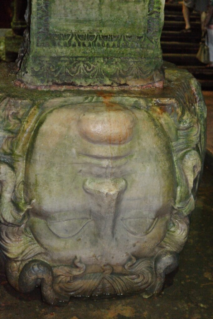 De cisterne bevat meer dan 300 zuilen die uit diverse tempels afkomstig zijn (er werd toen al gerecycled…). De twee meest opvallende zuilen rusten op Medusahoofden, de ene ligt ondersteboven en het andere op haar zij. Medusahoofden werden in de Oudheid gebruikt om het kwade oog af te wenden. Als je Medusa recht in haar ogen keek, zou je kunnen verstenen. Om het zekere voor het onzekere te nemen zijn deze zuilen dan maar op zijn kop gezet.