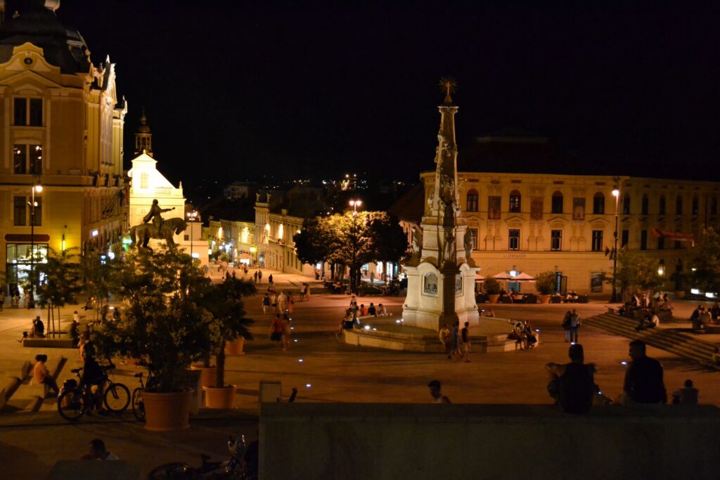 Pécs: het gezellige, levendige centrale plein in de avonduren