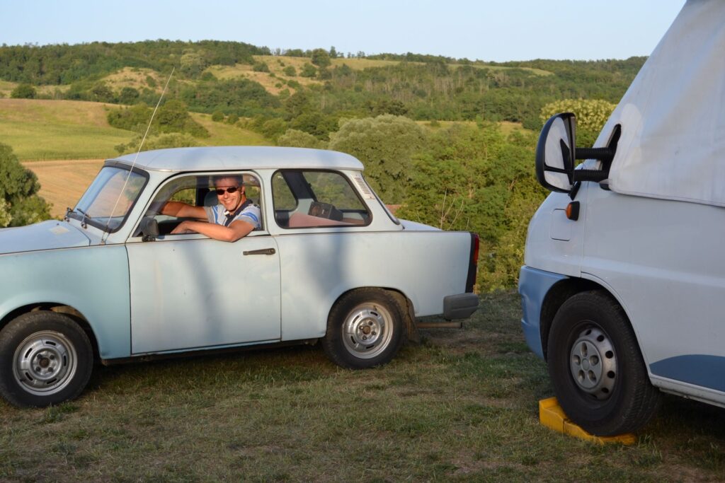 We hebben zin in goulash, een heerlijk traditioneel Hongaars gerecht. We vragen aan de campingeigenaresse van camping Jo Napot of zij een leuk restaurant weet op loop- of fietsafstand. Dat weet ze, maar dat restaurant ligt op twintig kilometer afstand van de camping, in Igal, dus niet op loop- of fietsafstand. Maar geen probleem, we kunnen bij de camping een Trabantje (door de eigenaresse liefkozend Trabbi genaamd) huren voor een avond! Normaal gesproken overleggen Ernst en ik altijd over het programma, maar toen ik naar Ernst keek, wist ik dat er geen discussie mogelijk was. Ernst zou mij die avond met Trabbi mee uit eten nemen.