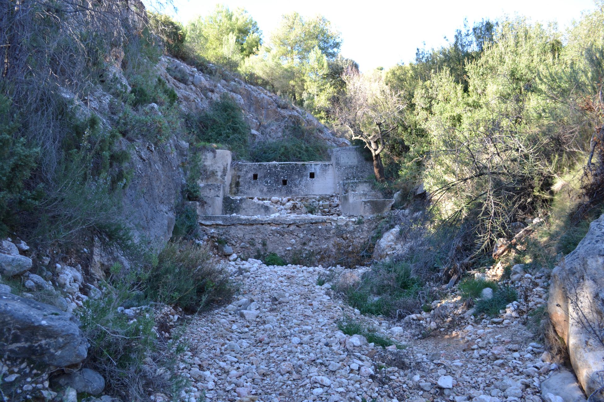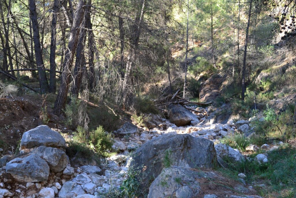 Even verderop verlaat je het pad en loop je een smal paadje in. Deze eindigt in een rivierbedding die je vervolgens enkele kilometers volgt. Dit gedeelte van de wandeling is uitdagend en avontuurlijk omdat je regelmatig over grote keien en over of onder omgevallen bomen moet klauteren. Ook moet je een aantal stuwdammen langs waarbij je per stuwdam even moet puzzelen hoe je het beste erlangs kunt komen. Bij de eerste stuwdam moet je rechts een paadje in, dan hoef je er niet langs. Bij stuwdam twee tot en met vijf is het het beste om aan de linker kant erlangs te gaan, soms door via rotsblokken omhoog te klimmen, soms kun je een aantal meters ervoor links omhoog het bos in.