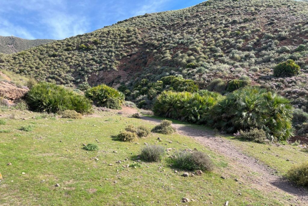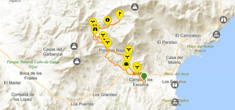 Vanaf de camping loop je eerst een stukje over een asfaltweg, waarna je deze snel verlaat en vervolgens via wildpaadjes langs struikjes en over een stenige piste naar boven loopt. Daar kom je uit op een onverhard pad. Deze leidt naar het dorp Presillas Bajas. Aan het eind van het dorp start de wit/groene en/of met witte pijlen gemarkeerde wandeling door en langs de rivierbedding naar de krater van een uitgedoofde vulkaan.