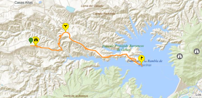 Vanaf het parkeerterrein wandel je eerst naar de Mirador waar je een prachtig uitzicht hebt op de Barrancos de Gebas (Badlands) en het turquoise water van het stuwmeer. Vanaf de Mirador loop je vervolgens via een breed stenig pad naar beneden. De gehele route is geel/wit en met richtingsbordjes (met resterende afstand) gemarkeerd.