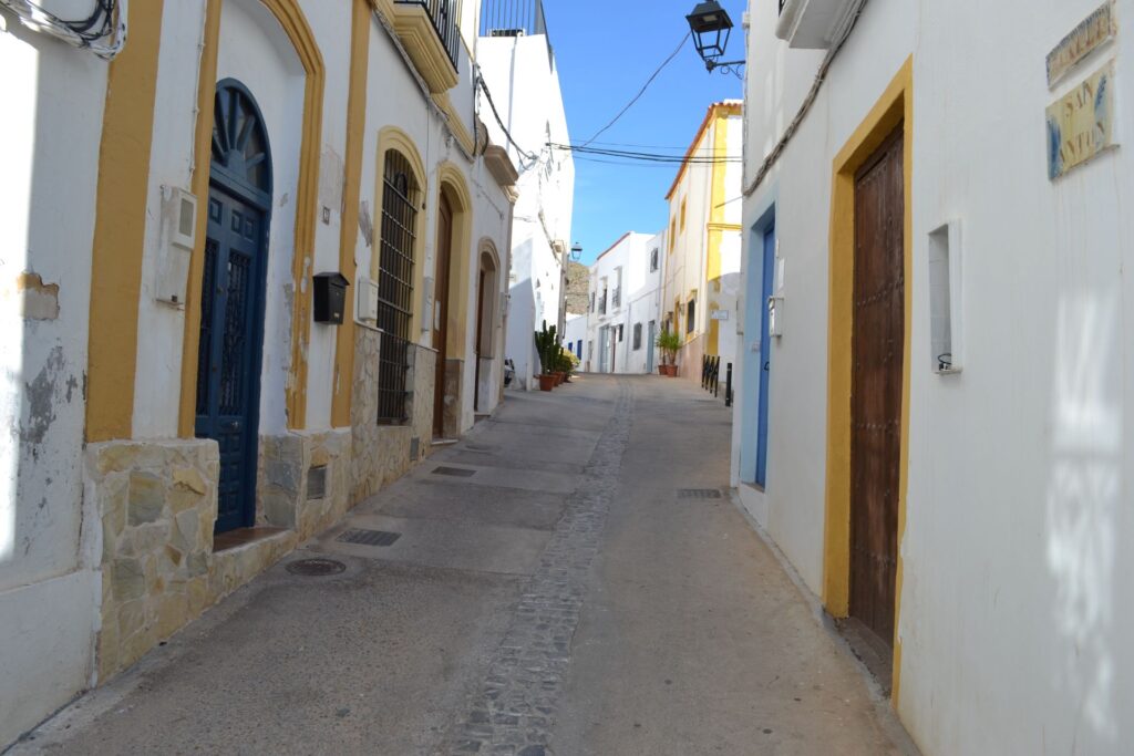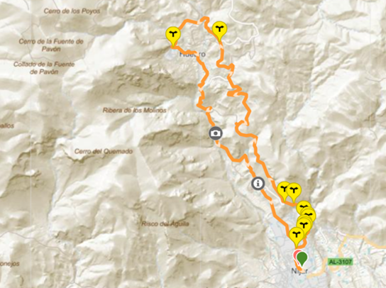 Vanaf het parkeerterrein wandel je eerst door de smalle steile straatjes van Níjar. Dan volgt een stukje onverhard, langs de Mirador en Torre de la Atalaya. Uiteindelijk kom je op een smalle, steile asfaltweg die kronkelend omhoog naar Huebro loopt. Er rijden zeer weinig auto’s.
