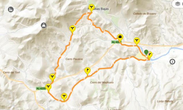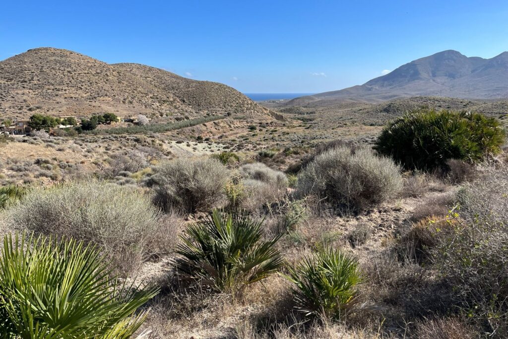 Vanaf de camping loop je richting het dorp Presillas Bajas. Vlak voor het dorp ga je een MTB-pad in. Dit pad is redelijk breed en stenig maar goed te belopen. Het pad stijgt licht en naarmate je hoger komt ontvouwt zich aan de linker kant het prachtige uitzicht op Los Escullos en het blauwe water van de Middellandse zee. Het MTB-pad komt uiteindelijk uit bij bebouwing.
