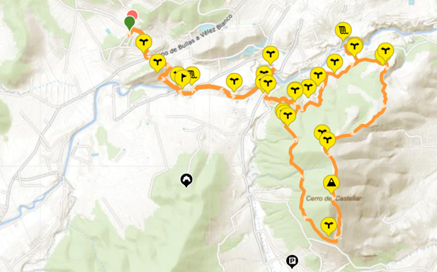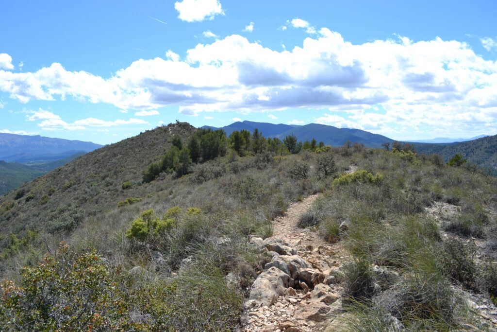 Vervolgens wandel je een stukje dezelfde weg terug naar de voet van de berg Castellar. Er loopt een smal stenig wandelpaadje de berg op. Het is een behoorlijke klim, maar onderweg en bovenop de top heb je prachtig uitzicht op de omgeving. Vanaf de top El Castellar kun je aan de andere kant van de berg via een smal stenig paadje weer naar beneden lopen. Het eerste deel is behoorlijk steil en kan glad zijn door losliggende stenen. Het pad is niet overal heel duidelijk maar als je het spoor volgt, loop je goed. Halverwege de afdeling loopt het smalle pad een tijdje redelijk vlak door de bossen heen. Het laatste stukje afdaling gaat over een breed niet al te steil pad.