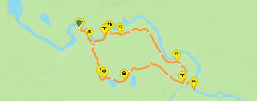 Het is een prachtige, goed uitgezette rondwandeling met als hoogtepunt een indrukwekkende waterval in een mooie kloof met rode rotsen. Ook passeer je een rendier kraal en een tweetal vuurplaatsen (met toilet). Je loopt voornamelijk over smalle bospaadjes en houten vlonders. De kans is groot dat je rendieren tegenkomt onderweg.
