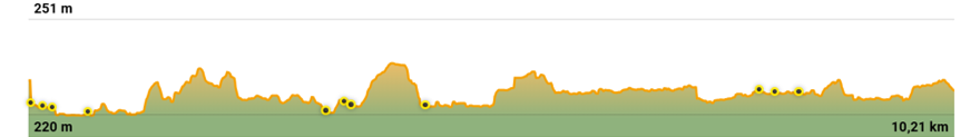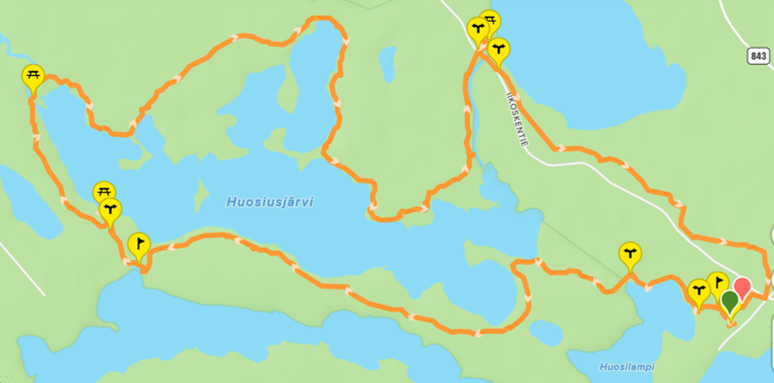 De route begint met een stukje Nature Trail en gaat later over in de Huosiuksen Huikonen Trail. De route is met gele stippen en het laatste stukje met oranje stippen gemarkeerd.