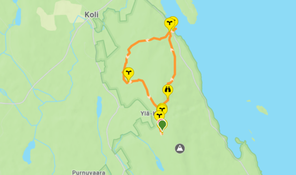 Het is een mooie, goed uitgezette rondwandeling door het bos met als hoogtepunt prachtige uitzichten op het meer met diverse eilandjes. Ook kun je een stop maken in de haven van Koli, waar je heerlijk op een bankje aan het water kunt pauzeren. Je passeert tevens een vuurplaats. Je loopt voornamelijk over smalle bospaadjes (die niet altijd vlak zijn in verband met stenen en boomwortels). Er zitten stijgende en dalende passages in de route.